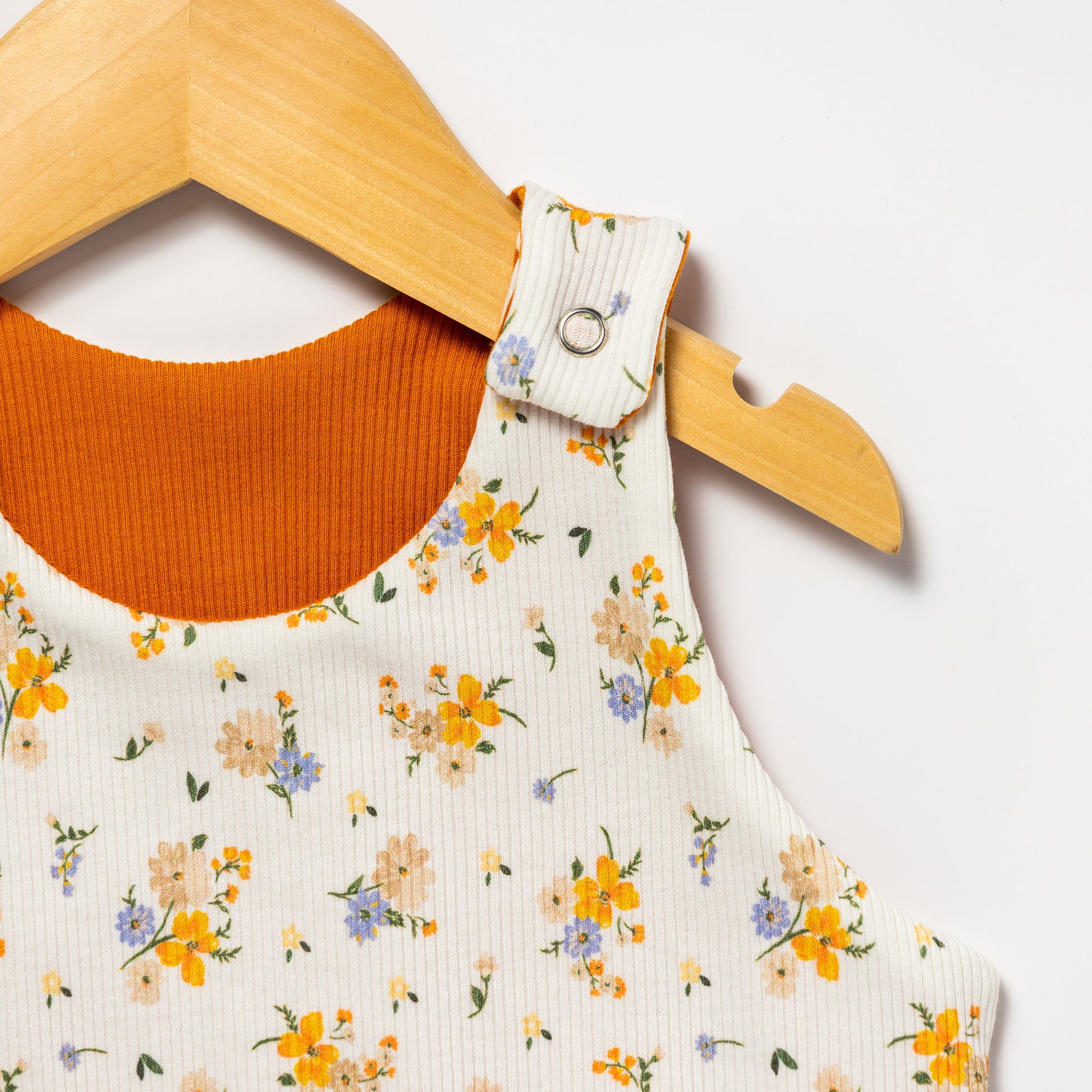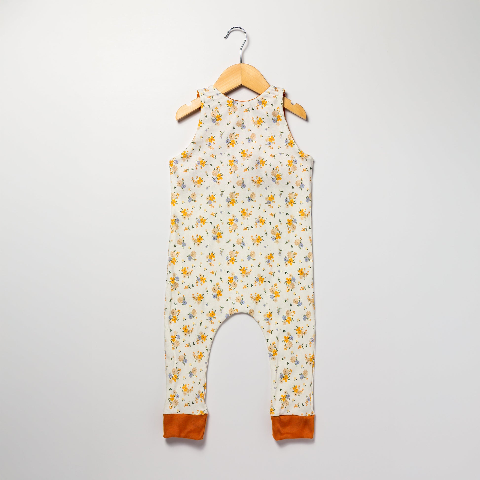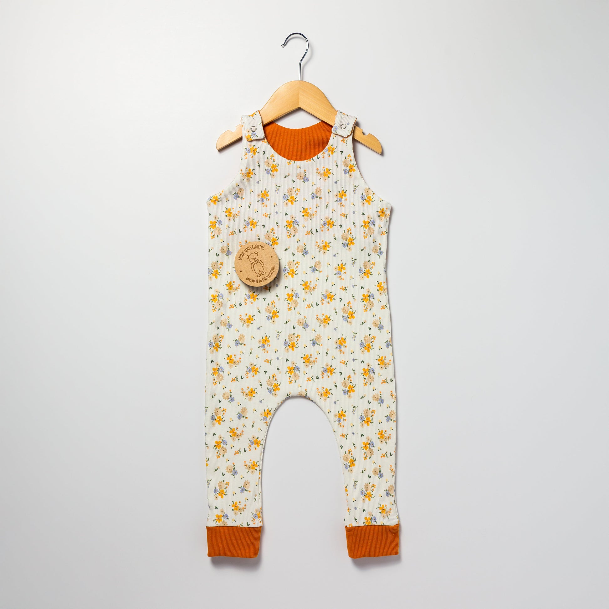 A gorgeous blue and orange flower design makes for a fun and easy to wear romper which is perfect for everyday use, special occasions and baby shower gifts. Each romper is semi lined with the cuffs matching the lining.